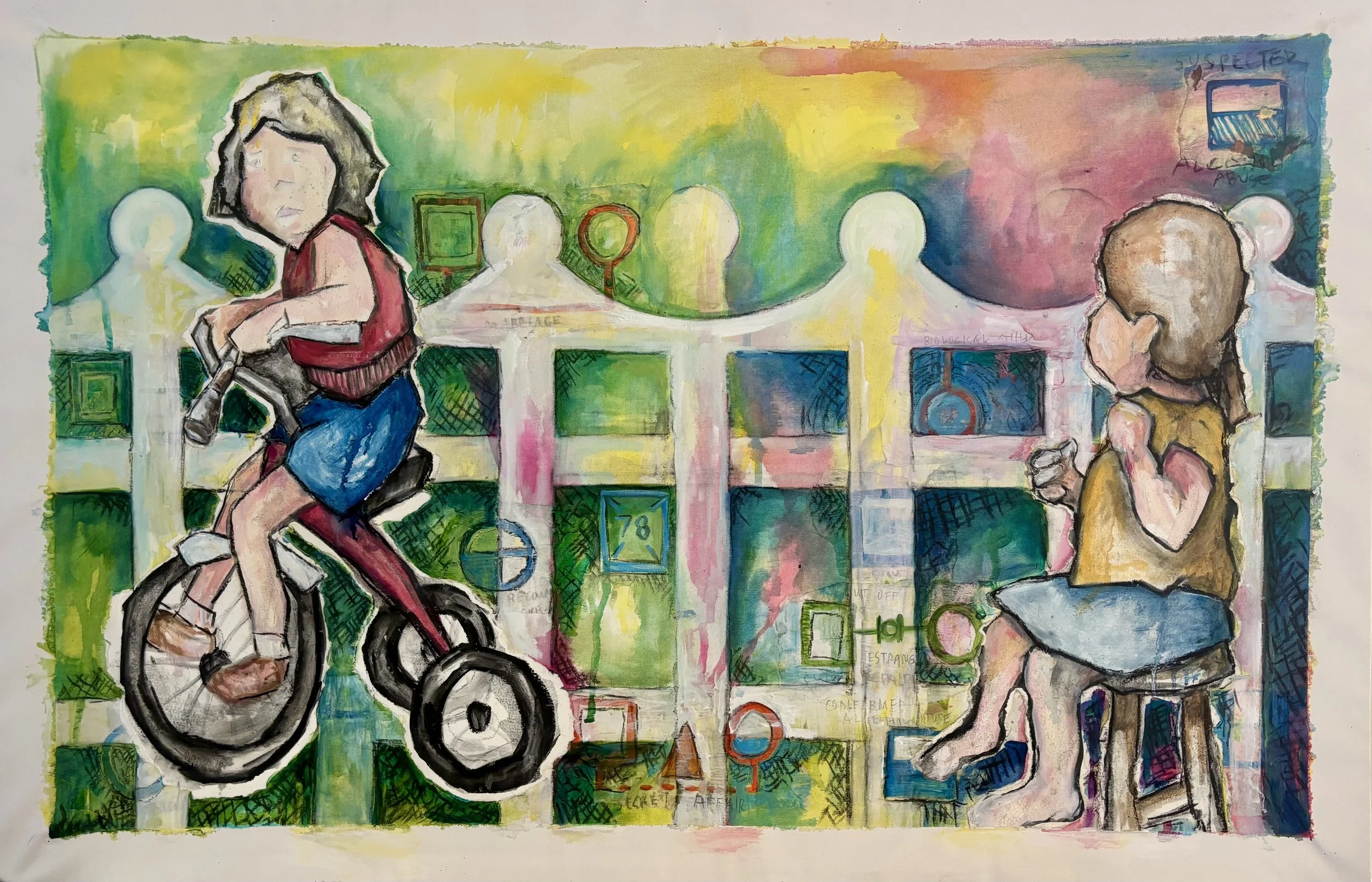 These more painterly pieces introduce the characters that make up my family mythologies. Figures are intentionally rendered in altered perspectives and high chroma to create a sense of unease. Inner anxieties come through with awkward positioning and strained surroundings.